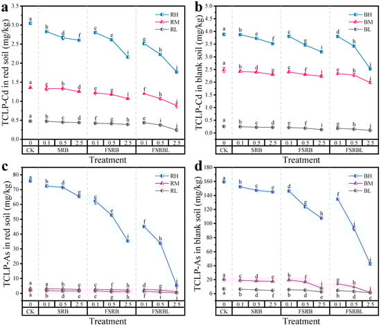 Soil leaching amounts of TCLP-Cd and TCLP-As in red soil (a,c) and black soil (b,d) under different treatments. Error bars represent standard deviation (n = 3), and lowercase letters indicate statistically significant differences among treatments (p < 0.05, Duncan’s test).