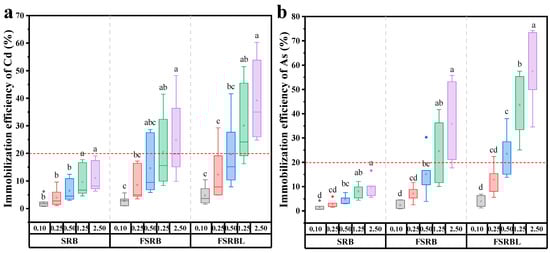 Overall comparison of the immobilization efficiency of SRB, FSRB and FSRBL for Cd (a) and As (b) in six soils at different addition amounts. Error bars represent standard deviation (n = 18), and lowercase letters indicate statistically significant differences among treatments (p < 0.05, Duncan’s test).