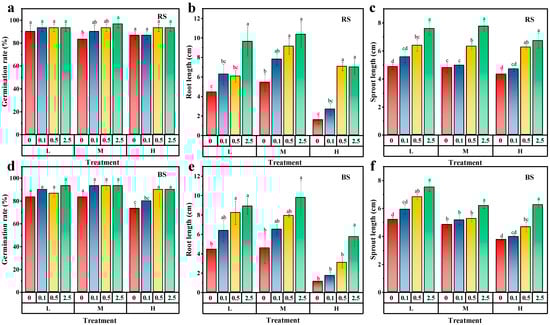 Mitigation effect of FSRBL addition on toxicity of contaminated soil leachate ((a,d)—seed germination rate; (b,e)—root length; (c,f)—stem length; soil type: red soil (a–c), black soil (d–f); pollution gradient: low (L), medium (M), high (H)). Error bars represent standard deviation (n = 3), and lowercase letters indicate statistically significant differences among treatments (p < 0.05, Duncan’s test).