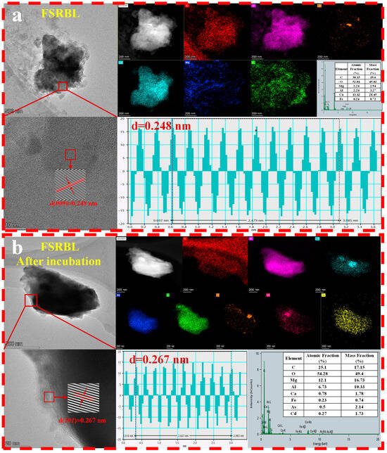 Surface element distribution and EDS spectrum before (a) and after (b) FSRBL incubation (the red box indicates the corresponding magnified area).