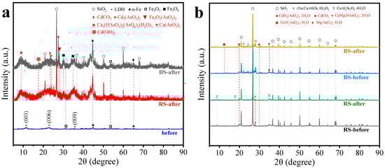 In order to further analyze the structural evolution and immobilization mechanism of the active components of FSRBL during the repair process, the XRD patterns of FSRBL before and after cultivation in red soil and black soil were further compared and analyzed (Figure 6a). The original FSRBL is mainly composed of LDH (PDF-#89-0460), α-Fe (PDF-#06-0696) and Fe2O3 (PDF-#84-0306). The enrichment of SiO2 (PDF-#46-1045) was detected in the FSRBL after cultivation in both types of soil, and the LDH structure was retained. At the same time, the characteristic peaks of the (220) and (311) crystal planes of Fe3O4 (PDF-#76-1849) appeared at 30.076° and 35.426°, indicating that Fe3+ was partially reduced to magnetic Fe3O4, which enhanced the surface redox activity. The immobilization of Cd2+ was evidenced by the formation of multiple crystalline phases. At 23.585°, 17.811°, and 24.361°, characteristic peaks corresponding to the (110), (110) and (130) crystal planes of CdCO3 (PDF-#85-0989), Cd(OH)2 (PDF#84–1767) and Cd3(AsO4)2 (PDF-#71-2080) were identified, respectively. This indicates that cadmium immobilization occurs simultaneously through carbonate precipitation, hydroxide precipitation, and arsenate co-precipitation. The peak of Fe4O3(AsO4)2 (PDF-#83-1554) (011) at 28.278° indicated the formation of Fe-As-O complex, reflecting that the Fe component was bound to As(V) by coordination adsorption. In addition, the appearance of the characteristic peak of the Ca(AsO3)2 (101) crystal plane at 27.622° in the black soil system (PDF-#75-0738) further revealed the soil-specific mechanism of the combination of Ca2+ and As(III) in FSRBL to form calcium arsenite precipitation. The above results indicate that FSRBL synchronously drives the mineralization immobilization of Cd (carbonate/arsenate) and the oxidative immobilization of As (Fe-As-O/Ca-As) by maintaining the structural stability of LDH, regulating the redox activity of Fe components, and synergizing the Ca/Mg/Al multimetallic effects.