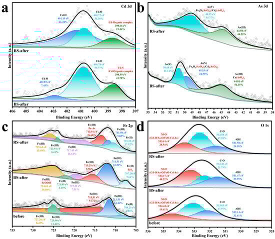 High-resolution XPS spectra of FSRBL before and after incubation (including Cd 3d (a), As 3d (b), Fe 2p (c), and O 1s (d); RS: red soil; BS: black soil).