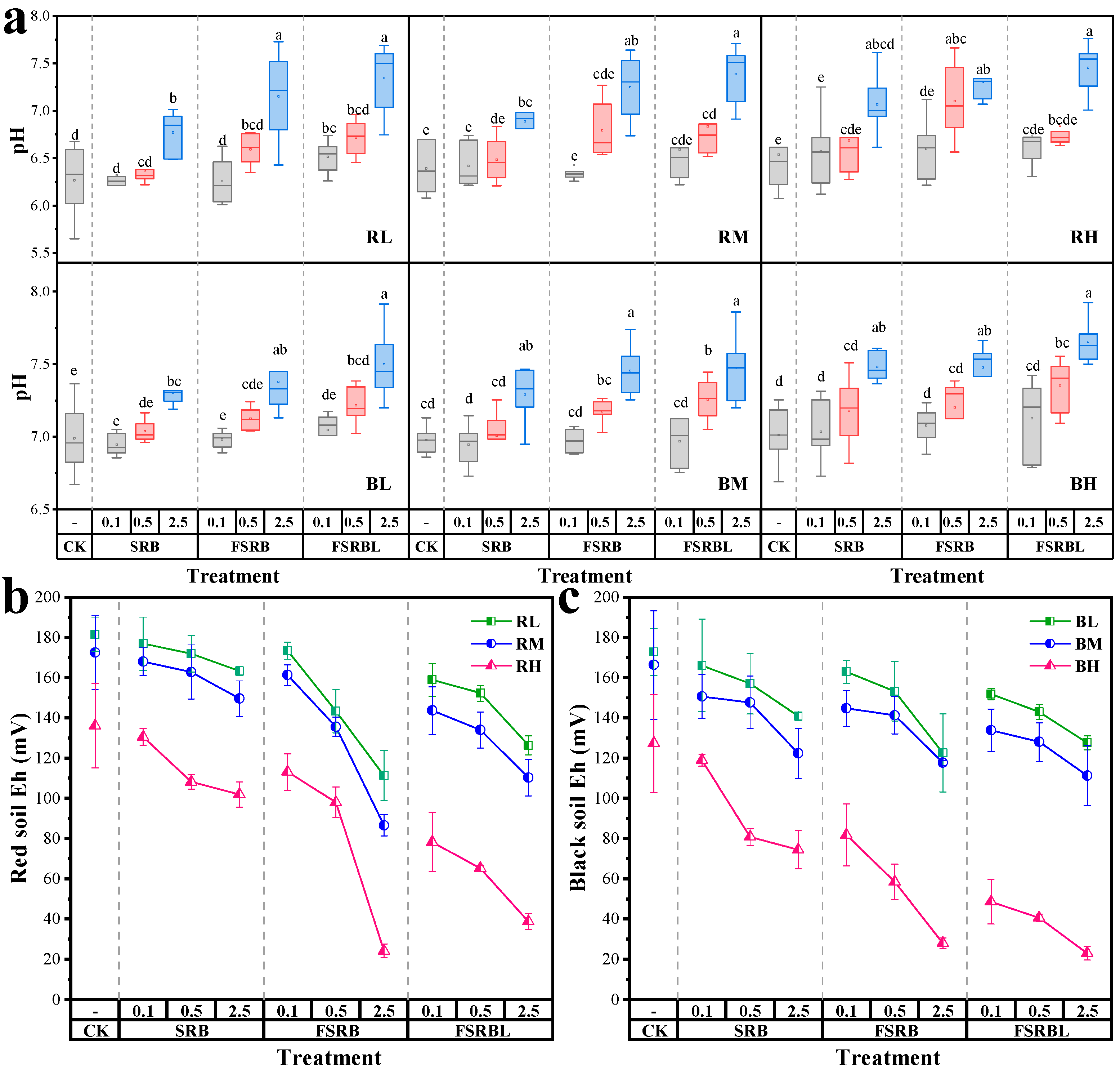 3.1. Effects of Biochar on Soil pH and Eh
