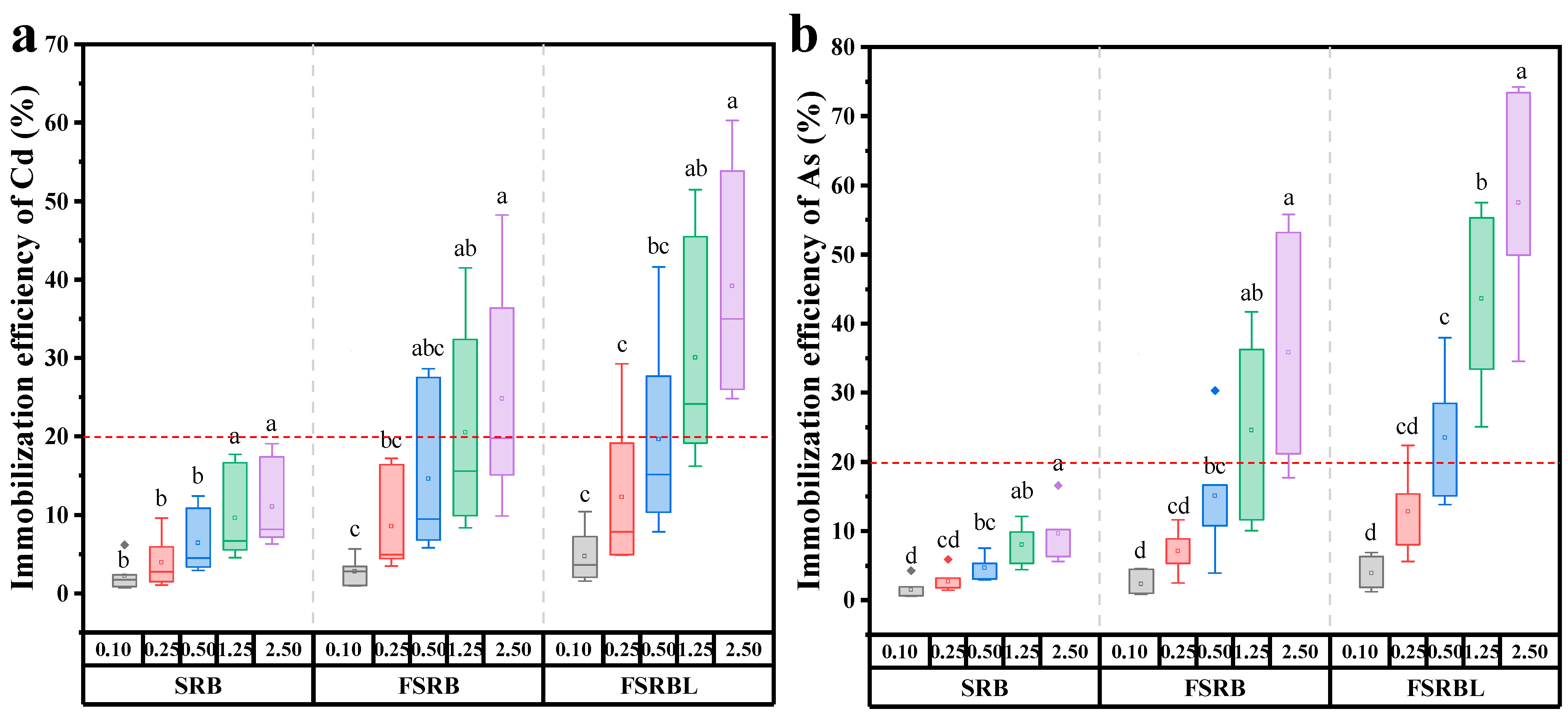 | FSRBL | Red soil | Cd As | 1.82 52.6 | 2.5% | 50 | 50.0 77.8 | This study |