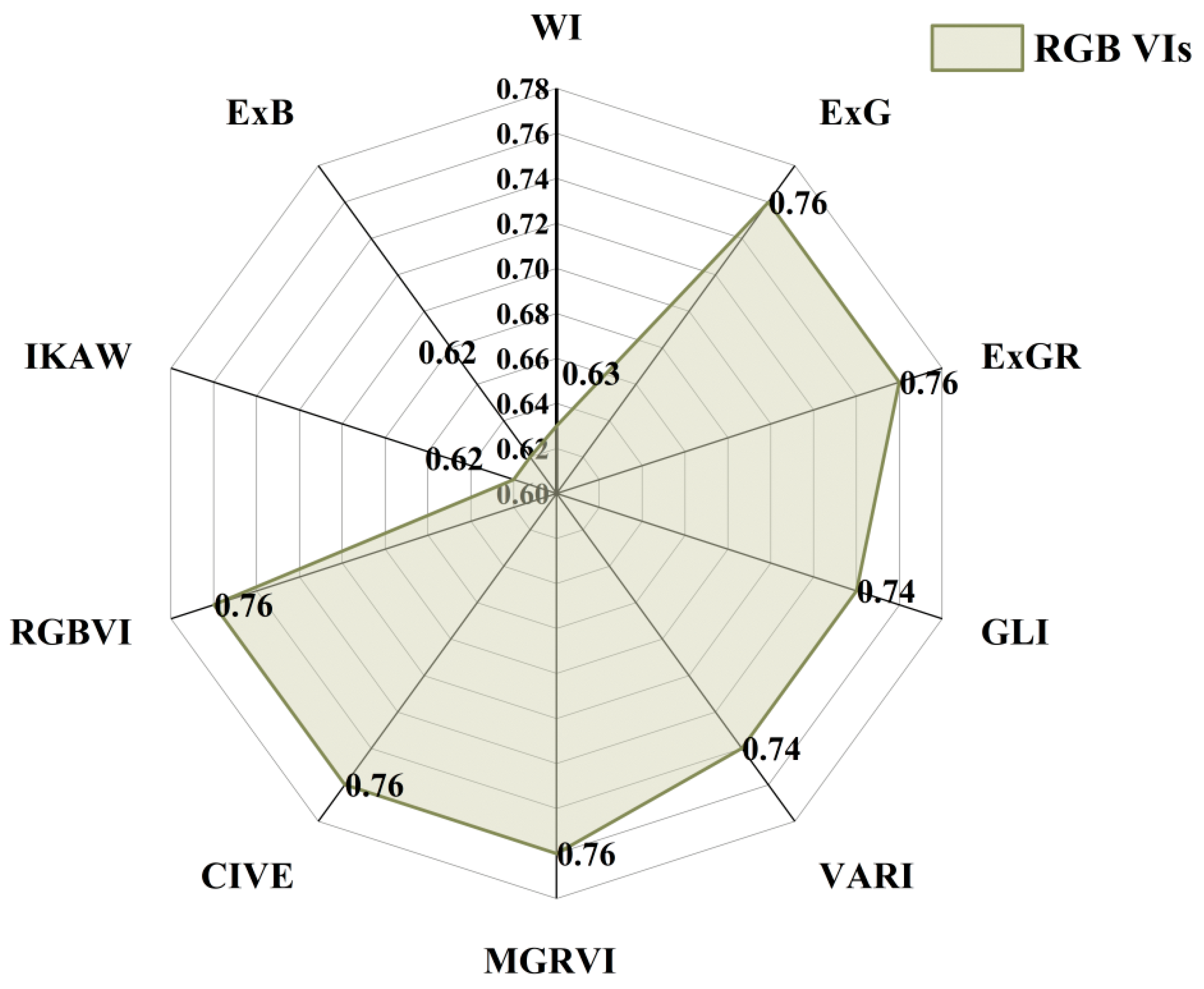 | RGBVI | Red Green Blue Vegetation Index | (g2 – b × r)/(g2 + b × r) | [31] | |
