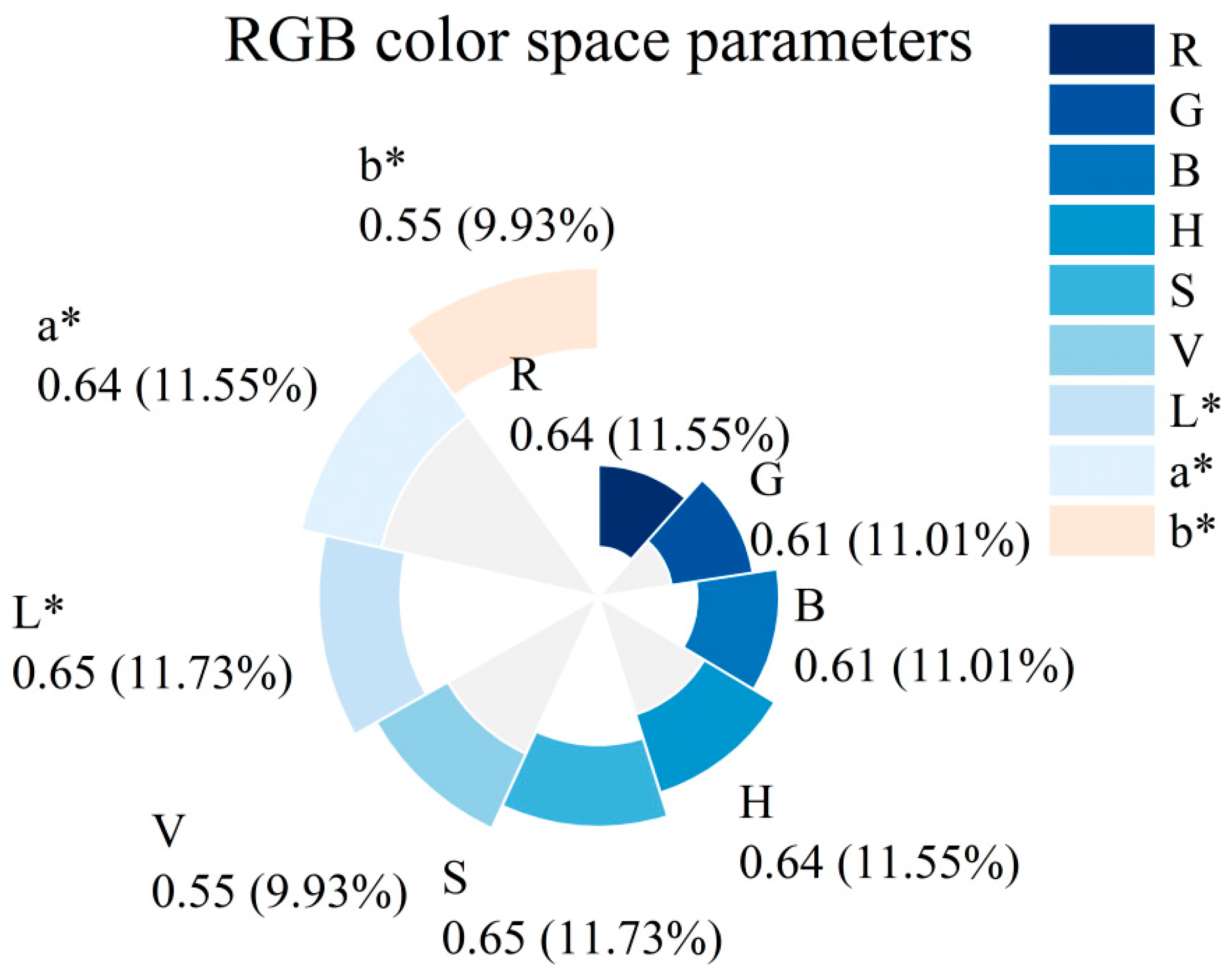| b* | Chroma (positive values mean yellow, negative values mean blue) | b* = 200[(Y/Y0)1/3 − (Z/Z0)1/3] (Z = 0.019r + 0.119g + 0.950, Z0 = 108.883) |