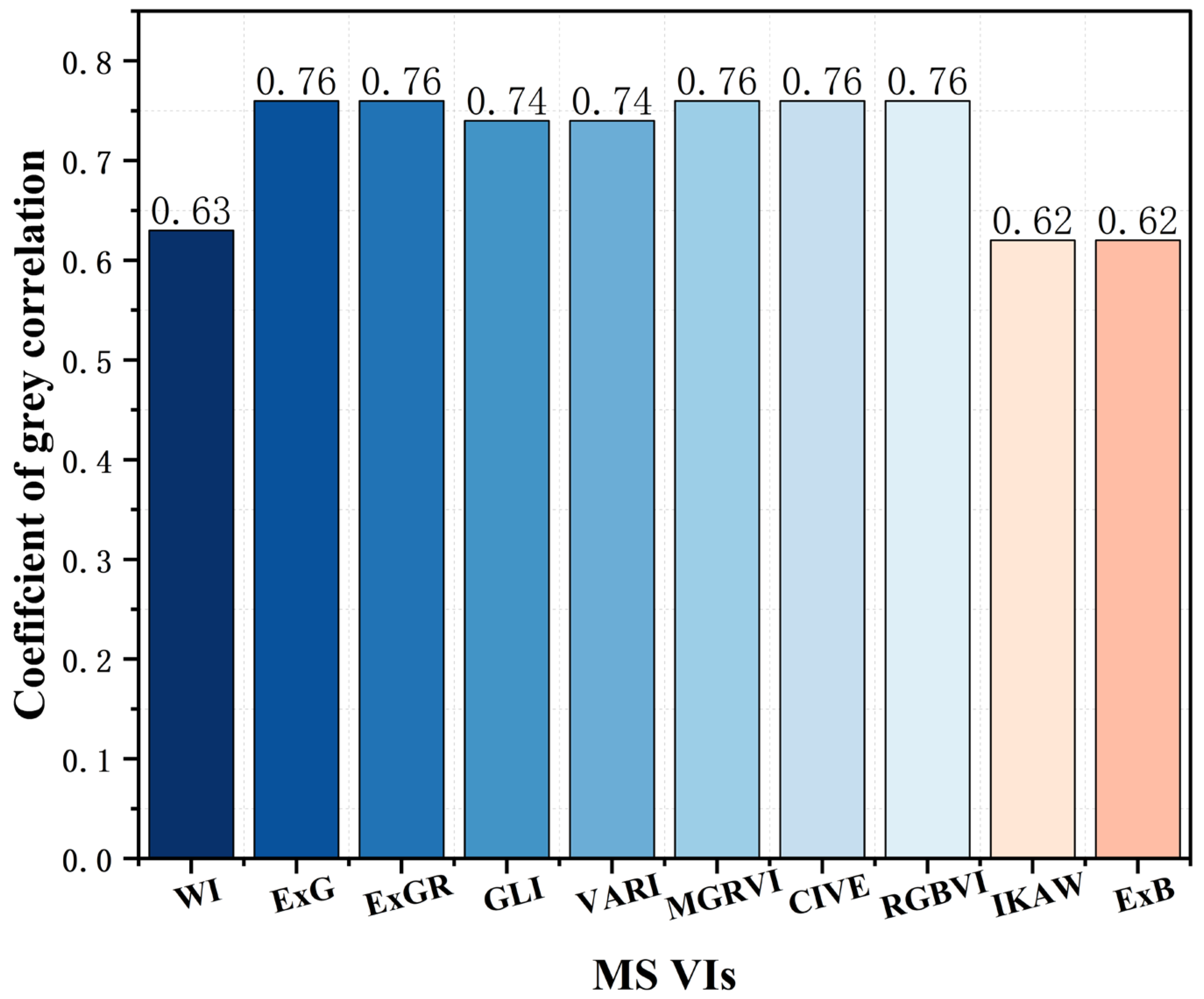| VARI | Visible Atmospherically Resistant Index | (g − r)/(g + r − b) | [30] | |