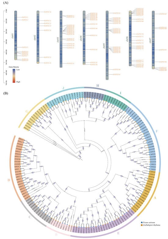 Chromosomal distribution and phylogenetic relationships of the PP2C gene family in pea. (A) Chromosomal locations of the 89 PsPP2C genes. All genes are mapped onto the pea chromosomes and labeled with their corresponding gene IDs. A red–blue gradient indicates local gene density, with red representing higher gene density and blue representing lower gene density. (B) Phylogenetic relationships between PP2C proteins from pea and A. thaliana. Pea and A. thaliana PP2Cs are marked with circles and squares, respectively. Pea PP2Cs were classified into subgroups A–J based on sequence similarity with A. thaliana proteins, and different background colors indicate these subgroups. Numbers at the nodes represent bootstrap support values, and the size of the light purple circles is proportional to the support value.