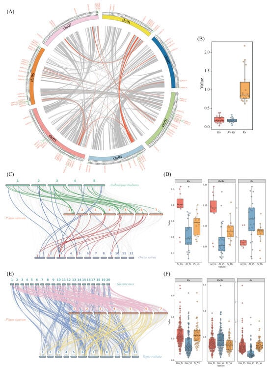 To characterize the evolutionary dynamics of the PP2C gene family, we performed both intra-species and inter-species synteny analyses in pea, followed by Ka/Ks-based selection pressure assessment (Figure 2A–F; Tables S2 and S3). Within pea, a total of 19 syntenic PsPP2C gene pairs were identified across the genome (Figure 2A), most of which were located on different chromosomes or in distinct chromosomal regions, indicating that segmental duplication has been the major contributor to gene family expansion, with only one tandem duplication pair (PsPP2C72–PsPP2C73) detected. Among the 18 duplicated pairs with reliable codon alignments, all Ka/Ks ratios were substantially below 1 (0.054–0.330), ranging from PsPP2C48–PsPP2C65 (Ka/Ks = 0.054) to PsPP2C29–PsPP2C87 (Ka/Ks = 0.330) (Figure 2B; Table S2). One pair (PsPP2C34–PsPP2C76) showed high synonymous divergence (pS ≥ 0.75), resulting in unreliable Ks estimation, whereas Ks values for the remaining pairs varied between 0.626 and 2.179, reflecting different historical duplication events under predominantly strong purifying selection.