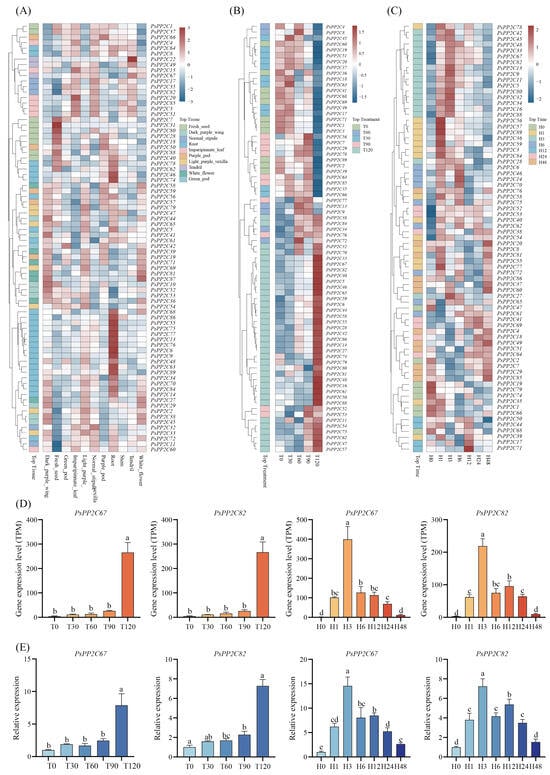 Expression profiles of PsPP2C genes across tissues and under salt stress. (A–C) Heatmaps showing the expression patterns of 89 PsPP2C genes across 11 tissues (A), under different NaCl concentrations (0–120 mM) (B), and across a 0–48 h salt-stress time course (C). Genes are clustered based on expression similarity, and the blue-to-red gradient represents low to high transcript abundance. The annotation panels between the gene clusters and the heatmap indicate the tissue, salt concentration, or time point at which each gene shows maximal expression. (D) TPM values of PsPP2C67 and PsPP2C82 under different NaCl concentrations and time points. (E) Relative expression levels of PsPP2C67 and PsPP2C82 under the same conditions, validated by RT-qPCR. Lowercase letters in panels (D,E) indicate significant differences among treatments according to LSD tests (p < 0.05).