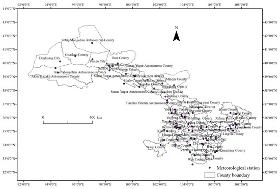 Gansu Province is an inland region, ranging from 32°31′—42°57′ N and 92°13′—108°46′ E and with a total area of 4.537 × 106 hm2. Gansu has complex and diverse landforms, including mountains, plateaus, plains, valleys and deserts. The terrain slopes from the southwest to the northeast, and the terrain is narrow and long, with a length of 1655 km from east to west and a width of 530 km from north to south. Gansu Province has a dry climate with a large daily temperature range, and the average annual temperature is 0~14 °C. The average annual precipitation is about 300 mm, but the precipitation varies greatly in different places, ranging from 42~760 mm, and decreases from the southeast to the northwest. Gansu Province is rich in light energy resources, with a long sunshine duration and strong solar radiation; the annual sunshine duration is 1700~3300 h, increasing from the southeast to the northwest. The distribution of precipitation is uneven in each season but is mainly concentrated between June and September. From southeast to northwest, it includes various climate types, from the north subtropical humid region to the high cold region and the arid region. The distribution of meteorological stations in the study area is shown in Figure 1.