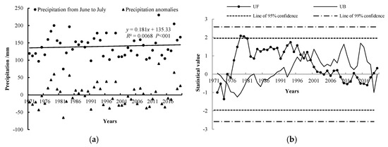 Over the past 50 years, the average amount of precipitation from June and July in the study area was recorded at 139.94 mm. The lowest and highest values of the average amount of precipitation during this period occurred in 1982 and 2013, respectively, measuring 74.48 mm and 230.10 mm, resulting in an amplitude of 155.62 mm. The inter-annual variation in the average amount of precipitation from June and July exhibited significant fluctuations; however, there was a slight increasing trend with an overall rate of 1.81 mm/10 a (Figure 2a), meaning that it increased by 1.81 mm every 10 years, leading to a total increase of 9.05 mm over the course of five decades. From the anomaly in the average amount of precipitation from June to July, it can be seen that the amount of precipitation shows an overall upward trend in the inter-annual fluctuation. In the 1970s, the precipitation showed a trend of decreasing first and then increasing. In the 1980s, except for 1982 and 1984, the amount of precipitation fluctuated up and down relative to the average value of the past years, but the overall increase or decrease was not large. During the first 10 years of the 21st century, the amount of precipitation decreased significantly, and the average amount of precipitation from 2018 to 2020 reached 176.18 mm, which was 36.24 mm higher than the annual average. According to the UF trend line of the M-K mutation test of the amount of precipitation from June to July (Figure 2b), the UF statistical value during 1971–1976 was less than 0, but the statistical value did not reach the level of the 95% confidence line, indicating that while the amount of precipitation showed a downward trend during this period, the decline was not significant. The increasing trend in the precipitation from 1977 to 2008 was not obvious. The decreasing trend in the precipitation from 2009 to 2018 was not significant either. The intersection points of the UF and UB curves appeared in 1975, 1998, 1999, 2000 and 2019, respectively. Further t tests showed that 1998 was the mutation point of the average amount of precipitation from June to July (p < 0.05).