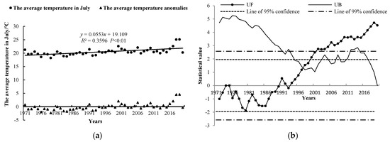 Change trend in the average temperature in July and its M-K mutation test. (a) Change trend; (b) M-K mutation test.