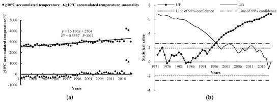 Change trend of ≥10 °C accumulated temperature change and its M-K mutation test. (a) Change trend; (b) M-K mutation test.