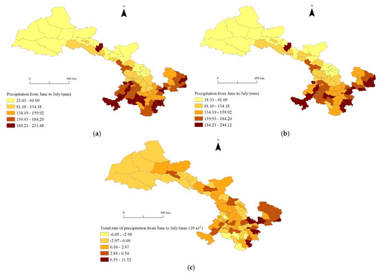 Spatial distribution of precipitation from June to July. (a) Precipitation in June and July from 1971 to 1998; (b) Precipitation in June and July from 1999 to 2020; (c) Trend rate for the precipitation from June to July.