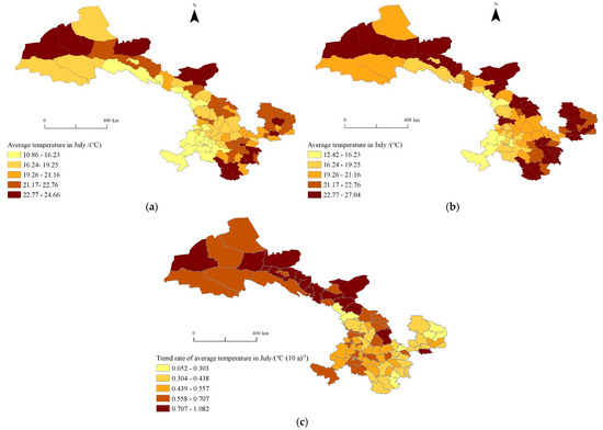 Spatial distribution of the average temperature in July. (a) Average temperature in July from 1971 to 1998; (b) Average temperature in July from 1999 to 2020; (c) Trend rate for the average temperature in July.