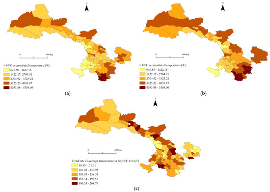 Spatial distribution of accumulated temperature above 10 °C. (a) Accumulated temperature above 10 °C from 1971 to 1998; (b) Accumulated temperature above 10 °C from 1999 to 2020; (c) Trend rate for the accumulated temperature above 10 °C.