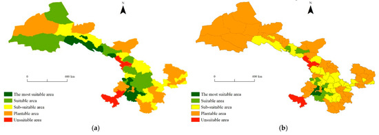 According to the ecological conditions of Gansu Province and considering the membership functions of each regional factor as well as the ecological characteristics of potato, and by referring to previous research results [12], this study classified Gansu Province into five distinct climatic regionalization areas: the most suitable areas, the suitable areas, the sub-suitable areas, the plantable areas and the unsuitable areas. The specific scope of each partition is shown in Table 1.