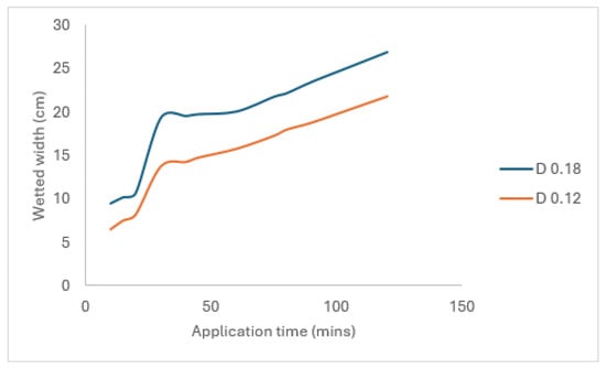 25]. This observation implies that the application time does not necessarily depend on the emitter discharge to impact the wetting front. This is also further confirmed by the strong or marked significant impact that the main effect of the irrigation application time had on the wetting front (wetting depth and width). This similarity in the analysis of the results observed in our study and that of Vishwakarma et al. [