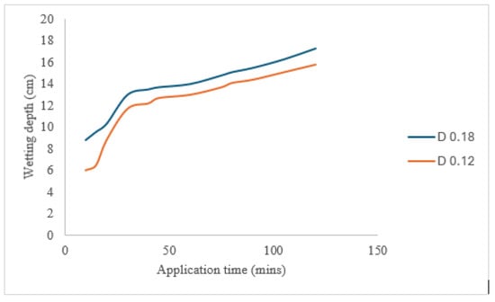 p < 0.05) impacted the wetted width and depth, with a significant difference observed after 60 min of water application; moreover, comparing the means of the wetting width and depth obtained at 60 min showed that there is no significance difference between those obtained at 120 min at both emitter discharges (0.12 and 0.18 LPH). Therefore, this result showed that the optimum application time for sandy soil is around 60 min. This is important to determine since the performance of plant growth and yield are dependent on the depth of water penetration under drip irrigation [