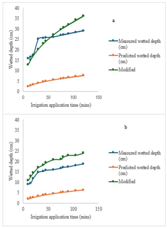 Figure 7). This volume of water corresponds to the irrigation application time of 75 min, and a wetting depth and width of 26.8 cm and 21.7 cm, respectively. The optimum wetting depth of 26.8 cm obtained in this study is around the depth where a hard pan is present at the field location. As a result, shallow rooted crops in the range of 25–30 cm depth are recommended to be planted at this location. Also, additional irrigation which may be applied beyond 75 min could lead to a wastage of water. This is because the extra water could be moving in a horizontal direction at this depth due to the hard pan (characterized by a high density and low porosity) present at a soil depth of about 30 cm. Several researchers [