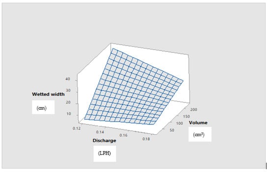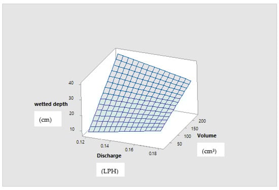 Figure 6. The figures further confirm that as the wetting depth and width increase the input parameters (amount of applied irrigation- volume) and irrigation application time increase. The analysis of these surface response plots is presented in the equations of