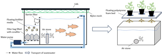 Schematic diagram of the aquaponics system. Hydroponics were conducted with four replications per treatment.