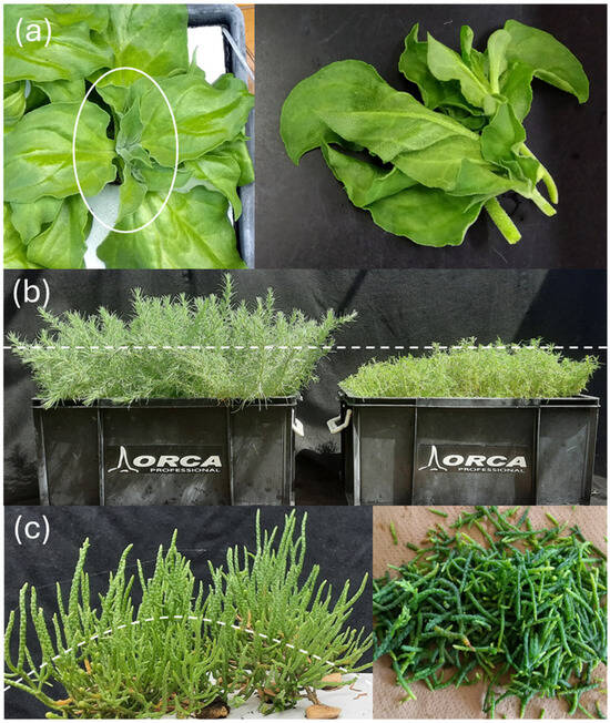 Marketable harvest of (a) ice plant, (b) romeritos, and (c) sea asparagus. In (a), the ellipse shows the younger shoots, which correspond to the marketable harvest of the ice plant, and the upper part from the dashed lines in (b,c) shows the approximate length of harvest that represents the marketable harvest of romeritos and sea asparagus, respectively.