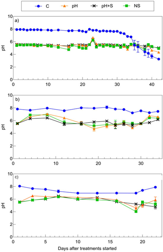 pH values of the rooting medium during the cultivation period of (a) ice plant, (b) romeritos, and (c) sea asparagus (total cultivation periods were 42, 34, and 22 days, respectively) under four different treatment conditions (C: untreated HSW as a control; pH: HSW with pH adjustment to 5.5; pH+S: HSW with pH adjustment to 5.5 and nutrient supplementation; NS: standard nutrient solution). Values are means ± s.e. (n = 4).