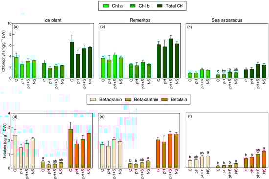 Content of chlorophyll and betalain in the marketable harvest of ice plant (a,d), romeritos (b,e), and sea asparagus (c,f) cultivated under four different treatment conditions (C: untreated HSW as a control; pH: HSW with pH adjustment to 5.5; pH+S: HSW with pH adjustment to 5.5 and nutrient supplementation; NS: standard nutrient solution). The values are mean + s.e. (n = 4). The different letters on the top of the error bars indicate significant differences among treatments based on Tukey’s honestly significant difference (HSD) test (p < 0.05).