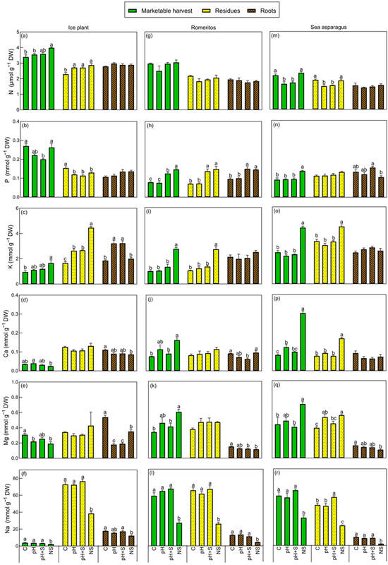 Nitrogen, P, K, Ca, Mg, and Na concentrations in ice plant (a–f), romeritos (g–l), and sea asparagus (m–r) cultivated under four different treatment conditions (C: untreated HSW as a control; pH: HSW with pH adjustment to 5.5; pH+S: HSW with pH adjustment to 5.5 and nutrient supplementation; NS: standard nutrient solution). Bars labeled with different lowercase letters (a, b, c) indicate significant differences among treatments (C, pH, pH+S, and NS) based on Tukey’s honestly significant difference (HSD) test (p < 0.05). The values represent mean + s.e. (n = 4).