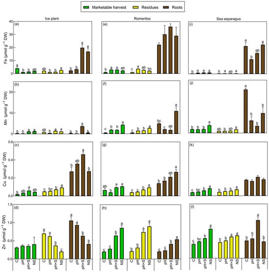 Iron, Mn, Cu, and Zn concentrations in ice plant (a–d), romeritos (e–h), and sea asparagus (i–l) cultivated under four different treatment conditions (C: untreated HSW as a control; pH: HSW with pH adjustment to 5.5; pH+S: HSW with pH adjustment to 5.5 and nutrient supplementation; NS: standard nutrient solution). Bars labeled with different lowercase letters (a, b, c) indicate significant differences among treatments (C, pH, pH+S, and NS) based on Tukey’s honestly significant difference (HSD) test (p < 0.05). The values represent mean + s.e. (n = 4).