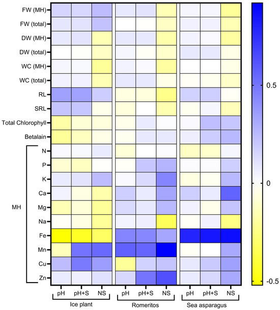 Figure 7 presents a heatmap summarizing the overall effects of the treatments on the main variables of growth and quality parameters evaluated. The results revealed varying plant responses in biomass accumulation, morphological traits, leaf pigments, and nutritional elements, depending on the plant species. Considering growth as a key indicator for evaluating the viability of these plants under this cultivation method, the results confirm that all species are suitable, as the fresh weight of the marketable harvest performed as well as or better than the control. For ice plant, the NS treatment resulted in higher fresh biomass accumulation; however, in terms of dry weight and water content, the NS treatment had a more negative impact on all three species. Similar negative effects were observed for root length and specific root length, where the pH and pH+S treatments were less impacted than NS. Leaf pigments were more negatively influenced in ice plant across all treatments, whereas romeritos and sea asparagus showed values similar to or higher than the control treatment. Figure 7 highlights only the nutritional content of the edible portion (marketable harvest). The NS treatment enhanced nutritional quality across all three species, likely due to its lower Na content, which facilitated better mineral absorption. However, this did not translate into improved dry biomass accumulation. In romeritos and sea asparagus, acidification of the rooting medium and mineral supplementation (pH and pH+S treatments) further improved nutrient uptake. In contrast, ice plant exhibited lower nutritional quality compared to the control, despite acidification and supplementation enhancing the content of P, K, Mn, and Cu.