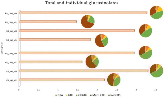 Total glucosinolates and the related profile of BR (Broccolo nero) and CR (Cavolo Broccolo Ramoso Calabrese), with M0 = H2O and 0 µmol L−1 melatonin; M1 = H2O and 100 µmol L−1 melatonin; I100 = 100% irrigation; I60 = 60% irrigation; GRA = glucoraphanin, GBS = glucobrassicin, OHGBS = 4-hydroxiglucobrassicin, MeOHGBS = 4-methoxyglucobrassicin, NeoGBS = neoglucobrassicin.