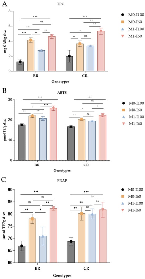 Comparative antioxidant activities of BR (Broccolo nero) and CR (Cavolo Broccolo Ramoso Calabrese): (A) Total phenolic content (TPC), (B) ABTS Radical Scavenging, and (C) FRAP assay results. n.s. not significant, *, **, and *** significant at p < 0.05, p < 0.01, and p < 0.001, respectively. M0 = H2O and 0 µmol L−1 melatonin; M1 = H2O and 100 µmol L−1 melatonin; I100 = 100% irrigation; I60 = 60% irrigation.