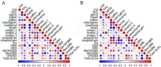 Pearson’s correlation coefficients for (A) control (I100-M0) and (B) combined effects (I60-M1) among the different parameters studied. FW = fresh weight; TPC = Total Phenolic Content; ABTS = Radical scavenging activity; FRAP = Ferric Reducing Antioxidant Power; caffeic = caffeic acid hexose, chlorogenic = chlorogenic acid, coumaroyl = coumaroyl quinic acid, ferulic = ferulic acid, sinapic 1 = sinapic acid 1, sinapic 2 = sinapic acid 2, sinapic 3 = sinapic acid 3, sinapolyl fer = sinapoyl feruloyl gentobioside, sinapolyl gen = sinapoyl gentobioside, tris = trisinapoyl gentobioside; GRA = glucoraphanin, GBS = glucobrassicin, OHGBS = 4-hydroxiglucobrassicin, MeOHGBS = 4-methoxyglucobrassicin, NeoGBS = neoglucobrassicin, Total GLSs = total glucosinolates.