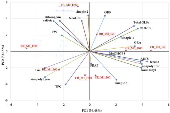 PCA Biplot of BR (Broccolo nero) and CR (Cavolo Broccolo Ramoso Calabrese) under melatonin application and drought stress conditions. M0 = H2O and 0 µmol L−1 melatonin; M1 = H2O and 100 µmol L−1 melatonin; I100 = 100% irrigation; I60 = 60% irrigation. FW= fresh weight; TPC =Total Phenolic Content; ABTS = Radical scavenging activity; FRAP = Ferric Reducing Antioxidant Power; caffeic= caffeic acid hexose, chlorogenic = chlorogenic acid, coumaroyl = coumaroyl quinic acid, ferulic= ferulic acid, sinapic 1 = sinapic acid 1, sinapic 2 = sinapic acid 2, sinapic 3 = sinapic acid 3, sinapolyl fer = sinapoyl feruloyl gentobioside, sinapolyl gen = sinapoyl gentobioside, tris = trisinapoyl gentobioside; GRA = glucoraphanin, GBS = glucobrassicin, OHGBS = 4-hydroxiglucobrassicin, MeOHGBS = 4-methoxyglucobrassicin, NeoGBS = neoglucobrassicin, Total GLSs = total glucosinolates.