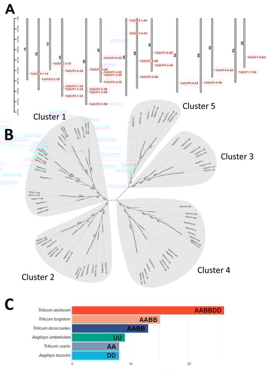 Figure 1. Chromosomal location and phylogenetic analysis of the TaDUF506 family. (A) Chromosomal distribution pattern of TaDUF506s. (B) Phylogenetic Analysis of TaDUF506 Family. (C) Number of DUF506 family members in T. aestivum and its ancestral species.