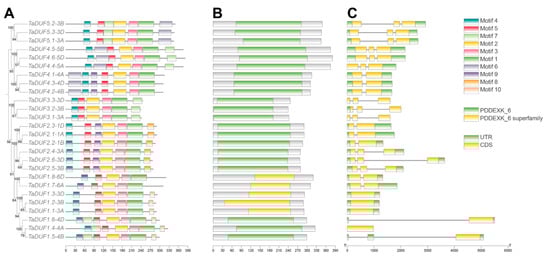 Figure 2. Distribution of motif, domain, and gene structure of TaDUF506 Family. (A) Motif distribution of TaDUF506 family. (B) Conserved domain visualization of TaDUF506s. (C) Gene structure analysis. Exons, introns, and untranslated regions (UTRs) are represented by yellow boxes, black lines, and green bars, respectively, illustrating structural variation among family members.