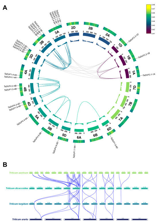Figure 3. Gene duplication event of TaDUF506 family, and its orthologous relationship with DUF506 in other plants. (A) WGD/segmental duplication events, gene density, and the localization of TaDUF506 members on the chromosomes are shown from the inside out. (B) Orthologous relationship of DUF506s between Triticum aestivum, Triticum dicoccoides, Triticum turgidum and Triticum urartu. Lines matching the color of their respective subchromosomal groups indicate whole genome duplication (WGD). Gray lines represent segmental duplications.