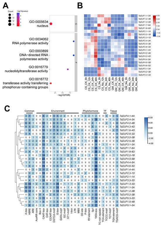 Figure 4. Functional, Expression, and Regulatory Analysis of the TaDUF506 Family. (A) GO enrichment analysis of the TaDUF506 family. The distribution of enriched GO terms related tomolecular functions and cellular components is presented. (B) RNA-seq expression profiling of the TaDUF506 family. Expression levels of TaDUF506 genes in two types of T. aestivum and under salt stress conditions are shown. (C) Heatmap of cis-regulatory elements in the TaDUF506 family. A heatmap illustrating the distribution of hormone-responsive, environment-responsive, and tissue-specific cis-regulatory elements across TaDUF506 genes.