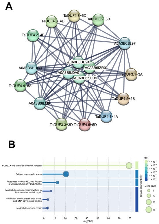 Protein-protein interaction (PPI) analysis, utilizing the STRING database, suggested that TaDUF506 family members interact with PD-(D/E)XK-like family proteins, implicating their involvement in essential biological processes, especially those associated with stress response (Figure 5A). Furthermore, PPI analysis revealed that TaDUF506 interacts with proteins involved in cellular stress response, implying a role in maintaining cellular homeostasis by protecting cells from oxidative stress and DNA damage. Additionally, interactions with proteins involved in nucleotide excision repair point to the family’s possible involvement in maintaining genome stability.