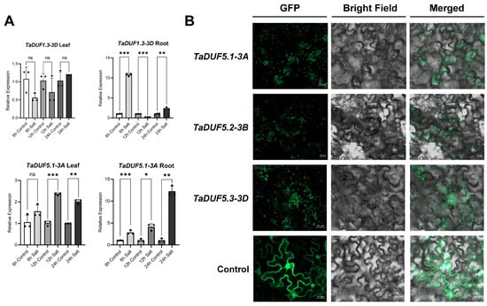 Figure 6. TaDUF506 Family Functional Validation. (A) qRT-PCR validation of TaDUF506 family gene expression under salt stress. (B) Subcellular localization of TaDUF506 family members. ns: p > 0.05, * p <0.05, ** p < 0.01, *** p < 0.001.