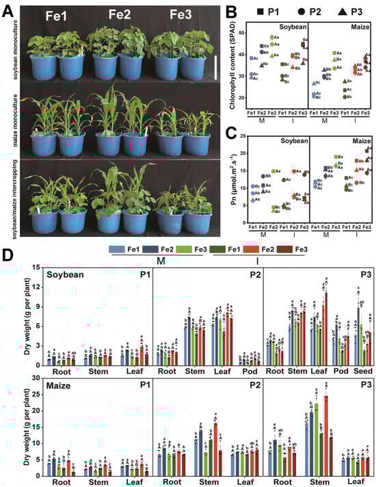 Effects of planting patterns and Fe content on plant growth. (A) Phenotype of soybean and maize under monoculture and intercropping systems across different soil iron concentration gradients. Bar = 30 cm. (B) Plant chlorophyll content, (C) net photosynthetic rate, and (D) dry weight of soybean and maize during three growth stages. The determination time is based on the growth cycle of soybean and includes three phases: P1 (the flowering stage), P2 (the grain stage), and P3 (the maturity stage). The planting patterns consist of M (monoculture) and I (intercropping). The Fe levels are categorized as follows: Fe1 (soil-effective iron content of 3 mg·kg−1), Fe2 (soil-effective iron content of 5 mg·kg−1), and Fe3 (soil-effective iron content of 8 mg·kg−1). The data are the mean values ± SE. For the same sampling time (B,C) or the same part of the plant (D), capital letters represent significant differences (p < 0.05) among different planting patterns at the same Fe level, and lowercase letters represent significant differences (p < 0.05) among different Fe levels under the same planting pattern.
