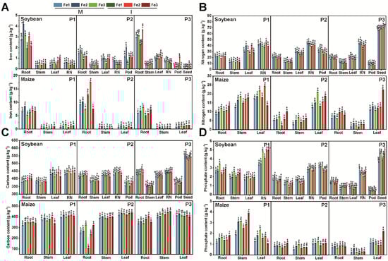 Effect of planting pattern and soil iron content on plant elemental content. Total iron (A), total nitrogen (B), total organic carbon (C), and total phosphorus (D) of different tissues of soybean and maize. The determination time is based on the growth cycle of soybean and includes three phases: P1 (the flowering stage), P2 (the grain stage), and P3 (the maturity stage). The planting patterns consist of M (monoculture) and I (intercropping). The Fe levels are categorized as follows: Fe1 (soil-effective iron content of 3 mg·kg−1), Fe2 (soil-effective iron content of 5 mg·kg−1), and Fe3 (soil-effective iron content of 8 mg·kg−1). The data are the mean values ± SE. For the same part of the plant, capital letters represent significant differences (p < 0.05) among different planting patterns at the same Fe level, and lowercase letters represent significant differences (p < 0.05) among different Fe levels under the same planting pattern.