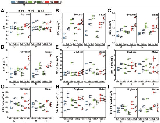 Effects of planting patterns and soil iron content on soil physicochemical properties, including soil pH (A), available iron (AFe) (B), soil organic carbon (SOC) (C), total nitrogen (TN) (D), nitrate nitrogen (NO3−-N) (E), ammoniacal nitrogen (NH4+-N) (F), soil urease (S-UE) (G), soil alkaline phosphatase (S-ALP) (H), soil β-glucosidase (S-β-GC) (I). The determination time is based on the growth cycle of soybean and includes three phases: P1 (the flowering stage), P2 (the grain stage), and P3 (the maturity stage). The planting patterns consist of M (monoculture) and I (intercropping). The Fe levels are categorized as follows: Fe1 (soil-effective iron content of 3 mg·kg−1), Fe2 (soil-effective iron content of 5 mg·kg−1), and Fe3 (soil-effective iron content of 8 mg·kg−1). A three-way analysis of variance was conducted to examine the effects of time, crop type, and Fe level. The data are the mean values ± SE. For the same sampling time, capital letters are used to indicate significant differences (p < 0.05) among different planting patterns at the same Fe level, and lowercase letters indicate significant differences (p < 0.05) among different Fe levels under the same planting pattern.