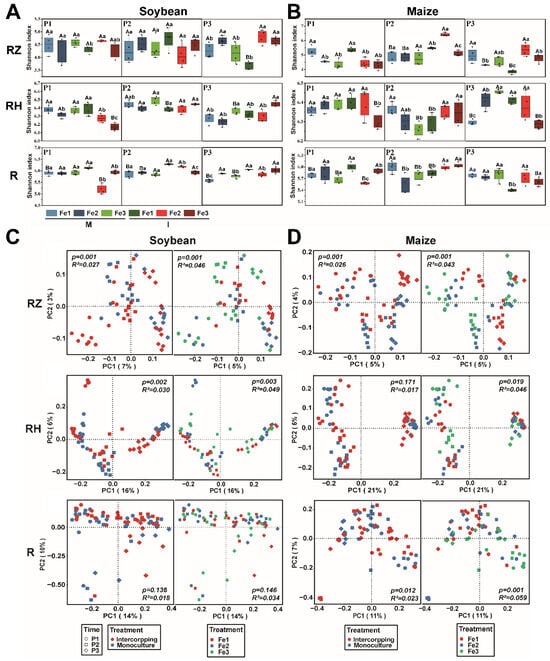 The Shannon index of bacterial communities in the root (R), root zone (RZ), and rhizosphere (RH) of soybean (A) and maize (B). The determination time is based on the growth cycle of soybean and includes three phases: P1 (the flowering stage), P2 (the grain stage), and P3 (the maturity stage). The planting patterns consist of M (monoculture) and I (intercropping). The Fe levels are categorized as follows: Fe1 (soil-effective iron content of 3 mg·kg−1), Fe2 (soil-effective iron content of 5 mg·kg−1), and Fe3 (soil-effective iron content of 8 mg·kg−1). The data are the mean values ± SE. For the same sampling time, capital letters are used to indicate significant differences (p < 0.05) among different planting patterns at the same Fe level, and lowercase letters indicate significant differences (p < 0.05) among different Fe levels under the same planting pattern. The Principal Coordinate Analysis (PCoA) analysis is based on the Bray–Curtis distance of bacterial community in RZ, RH, and R of soybean (C) and maize (D) under different planting patterns or iron contents.