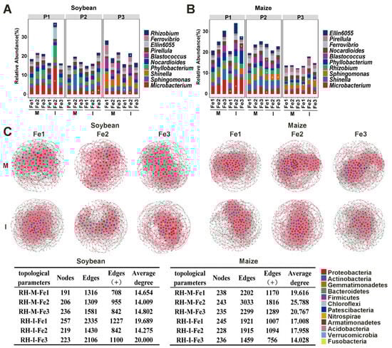 Effects of planting patterns and Fe content on bacterial community composition. Classification of rhizosphere bacterial community in soybean (A) and in maize (B) at the generic level. P1, flowering period; P2, grain period; P3, maturity period; M, monoculture; I, intercropping; Fe1, soil effective iron content 3 mg·kg−1; Fe2: soil effective iron content 5 mg·kg−1; Fe3: soil effective iron content 8 mg·kg−1. The asterisks indicate the significantly enriched microorganisms determined through Linear Discriminant Analysis (LDA). (C) Co-occurrence network (phylum level) and network topological parameters of rhizosphere bacterial community in soybean and maize under different planting patterns and iron contents. Nodes are colored according to the different phyla, and edges are colored based on positive and negative correlations, with red representing positive correlation and green representing negative correlation.