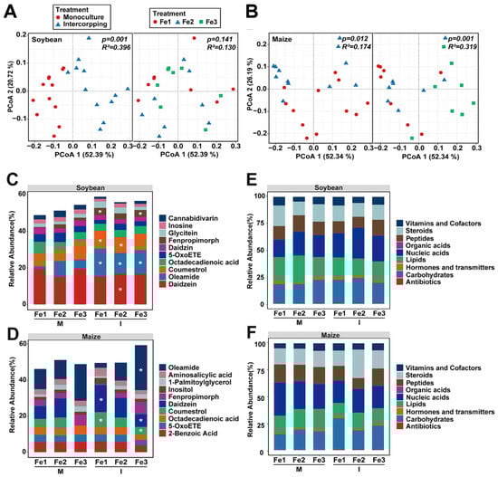 Intercropping and Fe content influenced the composition and structure of root exudates in soybean and maize (Figure 6A,B). The PERMANOVA revealed a significant disparity in soybean root exudates between monocropping and intercropping (p = 0.001, R2 = 0.396) (Figure 6A). In maize, significant variations were observed in root exudates among different planting patterns (p = 0.012, R2 = 0.174) as well as different Fe content (p = 0.001, R2 = 0.319) (Figure 6B).