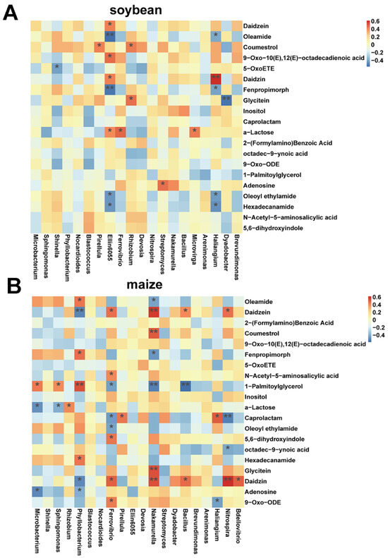 Correlation of heatmap between root exudates and rhizosphere microbial community in soybean (A) and maize (B). The asterisk indicates a significant correlation (* < 0.05, ** < 0.01).